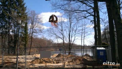 Seit Ostersonntag hängt über der Baustelle eine alte Richtkrone mit bunten Bändern und weißt auf ein nicht vorhandendes Richtfest hin.