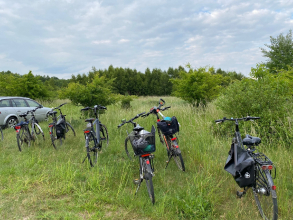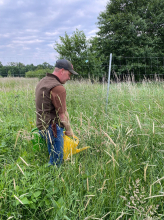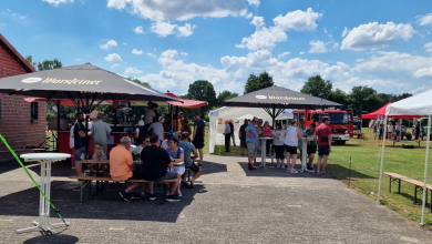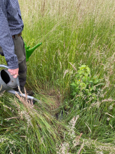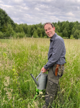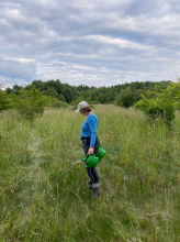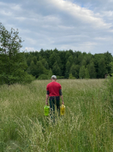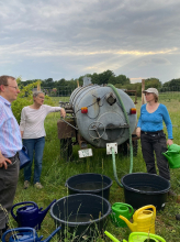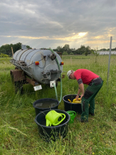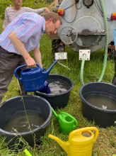 Bei der ersten Gießaktion wurden die Gießer*innen von der Feuerwehr unterstützt, die mit dem Löschwagen für Wassernachschub in den entlang des Zauns aufgestellten aufgestellten Bottichen sorgte. Da die Aktiven zurzeit aber fast jeden Abend für die Feuerwehrwettkämpfe üben, war bei der zweiten Gießaktion ein Fasswagen im Einsatz. Das bedeutete, dass die Wege, die man mit den gefüllten Gießkannen zurücklegen musste, deutlich weiter waren. Dennoch: ca. 2000l Wasser wurden an die Bäumchen in der Fläche verteilt. Zum Glück zeigte sich, dass die zur Max-Planck-Straße gelegene Fläche im Augenblick noch genügend Feuchtigkeit hat, so dass dort nicht gewässert werden musste.