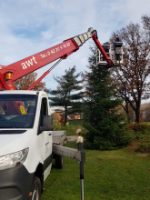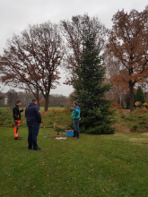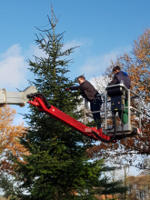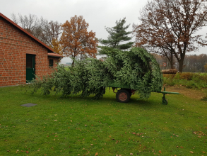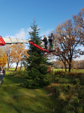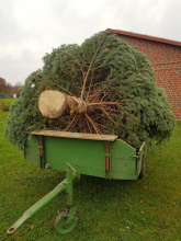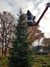 An diesem Wochenende wurde der Eitzer Weihnachtsbaum, der von Wolfgang Badenhoop gestiftet wurde zum Schützenhaus transportiert und mit viel Muskelkraft und mit Hilfe eines Radladers aufgestellt. Da es sich bei diesem Exemplar von Baum um den bisher größten handelt, war das Aufstellen gar nicht so einfach und brauchte viel Zeit und Nerven. Hier war man sich aber einig: Hier muss eine einfachere Lösung her! Letztlich misst der Baum nun von der Spitze bis zum Boden 7,30 Meter. Bereits beim Eitzer Weihnachtsbaum vor zwei Jahren war das anbringen der Lichterkette kein leichtes unterfangen. Die Leiter hätte noch gut 2 Sprossen mehr haben dürfen. So wurde auch aus dieser Sache gelernt und für dieses Jahr ein Steiger besorgt. Mit dessen Hilfe konnten wir insgesamt 300 Meter Lichterkette mit 3.000 LED's ein den Baum hängen.