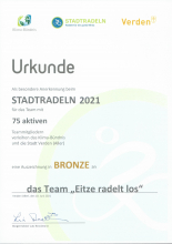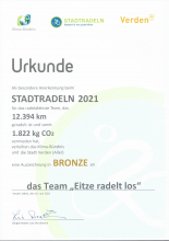 • Mit 75 teilnehmenden Radlerinnen und Radlern belegte das Team „Eitze radelt los“ den dritten Platz (1. Platz: Domgymnasium mit 144 Teilnehmern, 2. Platz: Oberschule Verden mit 111 Teilnehmern) • Mit 12.394 geradelten Kilometern belegte „Eitze radelt los“ ebenfalls den dritten Platz (1. Platz: Domgymnasium mit 26.706 Kilometern, 2. Platz: Focke-Verden mit 13.072 Kilometern)