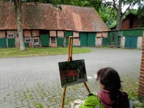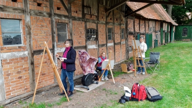 Plein-Air-Malerei konnte man am 1. Wochenende im Juli in Eitze erleben, denn der Heimat- und Kulturverein Armsen hatte einen Freilichtmalerei-Kurs mit dem Kunsttherapeuten Viktor Lau organisiert. Da in Armsen derzeit zahlreiche Ausbaumaßnahmen des Nahwärmenetzes sowie des Radweges von der Dorfmitte bis zur Landesstraße stattfinden und das Dorfgemeinschaftshaus Coronabedingt geschlossen ist, hat das Organisations-Team kurzerhand unsere Ortschaft Eitze als Standort ausgesucht. Die Gaststätte „Am Kamin“ war das „Basislager“ der Teilnehmerinnen und Teilnehmer und von dort aus suchten sie sich interessante Motive: der Oelfkenhof selbst, der Stoffers Hoff, der alte Speicher von 1721 auf dem Hof von Karsten Oestmann. Leider war das Wetter an den Tagen des Malkurses nicht so gut, so dass weitere angedachte Motive, wie die Eitzer Mühle, der Mühlenteich oder auch ein Blick in die Allerauen buchstäblich ins Wasser gefallen sind. Gut war, dass Magret Wagner der Gruppe ihre überdachte Terrasse zur Verfügung gestellt hat, wo im Trockenen die Bilder vollendet bzw. nach Vorlagen (Fotos) gemalt werden konnten. Allen Beteiligten hat das Malen in der Gruppe und die herzliche Aufnahme in der Ortschaft Eitze so gut gefallen, dass der nächste Plein-Air-Kurs, der für den 3. und 5. August geplant ist, voraussichtlich wieder in Eitze stattfinden wird.