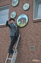 Der 2. Ritter Sascha Thies brachte unterhaltsam die Königscheibe ans Haus an, bevor die Schützen – vorbei an liebevoll geschmückten Gärten, zum Schützenhaus zurückmarschierten.