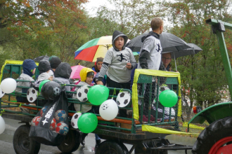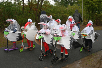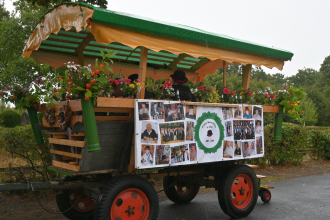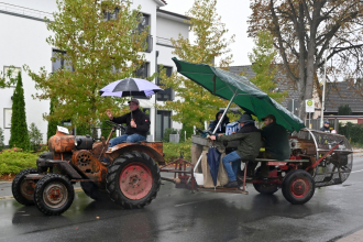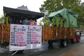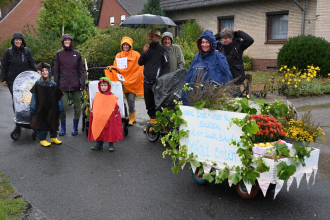 Der diesjährige Sommer war sonnig, heiß und wochenlang zu trocken. Dass nun gerade zum Eitzer Erntefest ein solches Schietwetter mit Dauerregen herrschte, war schade. So war der wohl am häufigsten geäußerte Satz an diesem Tag: „So ein Wetter hatten wir noch nie auf dem Erntefest!“. Die Teilnehmer am Erntefestzug ließen sich aber ihre gute Stimmung nicht verderben. Ausgerüstet mit Schirmen, Regenkleidung, Planen und umfunktionierten Sonnenschirmen zogen die bunt geschmückten Wagen und Fußgruppen zusammen mit dem noch leeren Wagen der drei Erntebräutigame durch die Ortschaft zur Walsroder Straße, um bei Familie Jacobs die Erntekrone abzuholen. Auf seinem Weg durch Eitze wurde der Brautwagen von wunderhübsche Blumenmädchen, den schwarz-weiß-rot gekleideten Melonen-Boys, einem ganzen Schwarm Störche, einer Gruppe mit einem Kartoffelroder, einer kompletten Fußballmannschaft, dem Ernte-Festival, aber auch von den Eitzer Schützen, die ihren Wagen mit dem Slogan „Scheiß auf Layla, Lea und Olivia, wir haben Königin Silvia“ geschmückt hatten, begleitet. Bezug zu der aktuellen politischen Diskussion nahm eine Fußgruppe mit dem Thema „Unser Klima, unsere Erde schützen, damit wir auch in Zukunft Vielfalt ernten“.
