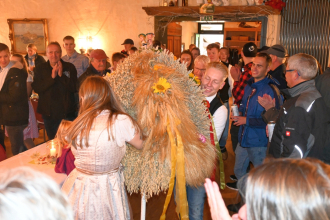 Bei der Erntebraut angekommen forderte Jan Wollschläger von Malin Jacobs die Erntekrone heraus. Der ihm zuerst überreichte Ast überzeugte ihn und die übrigen Anwesenden in keinster Weise, also warf er ihn "im hohen Bogen zur Tür hinaus". Darüber freuten sich besonders die Kinder, denn er war reichlich mit Bonbons verziert und wurde sofort geplündert. Auf seine erneute Forderung erhielt er dann die mit Disteln und Dornen, aber auch mit Blumen, bunten Bändern und dem in Eitze traditionellen Püppchenpaar verzierte Erntekrone. Nun zog der Tross weiter, diesmal mit der Krone und den Erntepaaren auf dem Wagen durch Eitze zum Oelfkenhof. Hier erwarteten die Teilnehmer und Besucher ein schön geschmückter Saal und ein Festzelt auf dem Hof. Die Hüpfburg, in den anderen Jahren Hauptanziehungspunkt für die Kinder war, wurde in diesem Jahr nur von den Hartgesottenen genutzt.