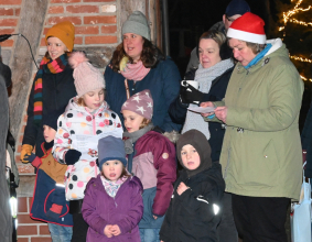 Am Spätnachmittag stimmten dann alle auf dem Hof gemeinsam einige Weihnachtslieder an - zum Glück, denn sonst hätte der Weihnachtsmann vielleicht nicht den Weg zum Dorfgemeinschaftshaus gefunden. Er beschenkte die Kinder mit kleinen, mit Süßigkeiten gefüllten Tütchen und wünschte allen Anwesenden frohe Weihnachten.